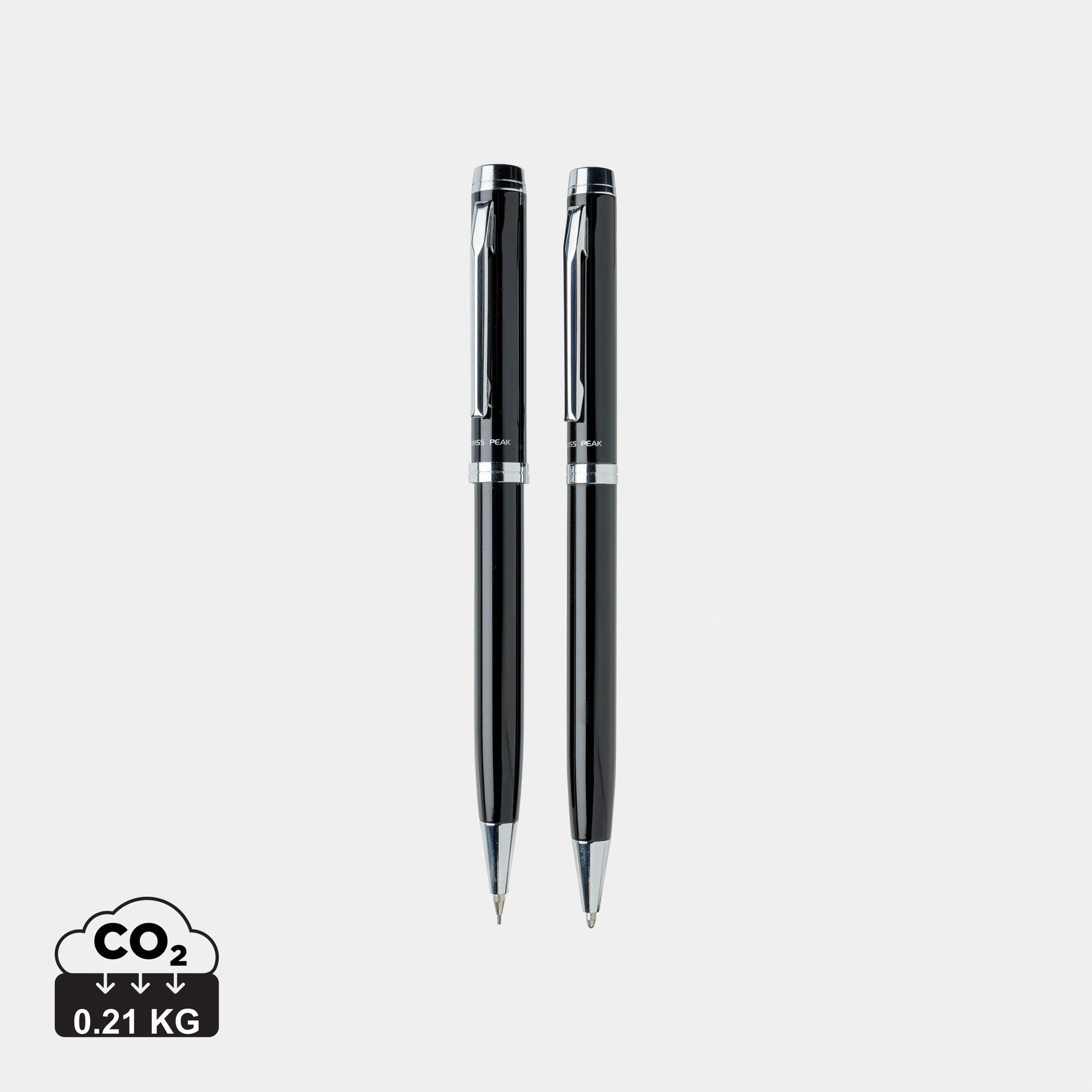 Підвищіть свій досвід письма за допомогою Swiss Peak Luca RCS Recycled Brass Deluxe Pen Set. Розроблений з урахуванням вишуканості, цей набір містить гладкі чорні ручки із золотими акцентами, включаючи верхню частину, верхнє кільце, кліпсу, середнє кільце та наконечник. Виготовлені з 55% сертифікованої RCS переробленої латуні, ці ручки пропонують як елегантність, так і стійкість. Кулькова ручка працює з поворотним механізмом і включає в себе поповнення синім чорнилом, пише шириною 1,0 мм до 1200 м. Ручка має синє гелеве чорнило, що пропонує 800 м гладкого письма на тій же ширині 1,0 мм. Обидві ручки оброблені сталевим затискачем і вигравірувані логотипом Swiss Peak на середньому кільці. Представлений у подарунковій коробці преміум-класу, цей набір випромінює розкіш та стиль.